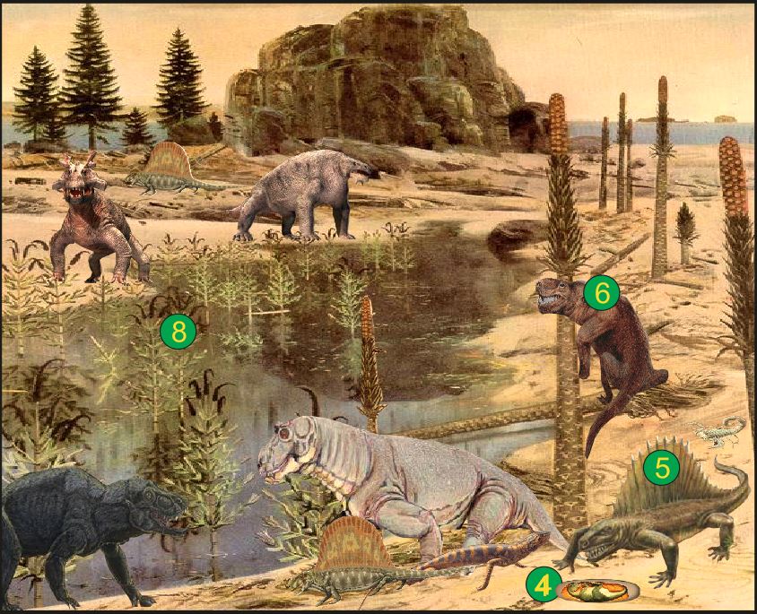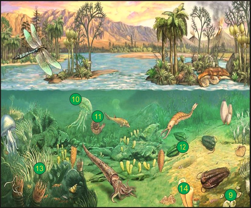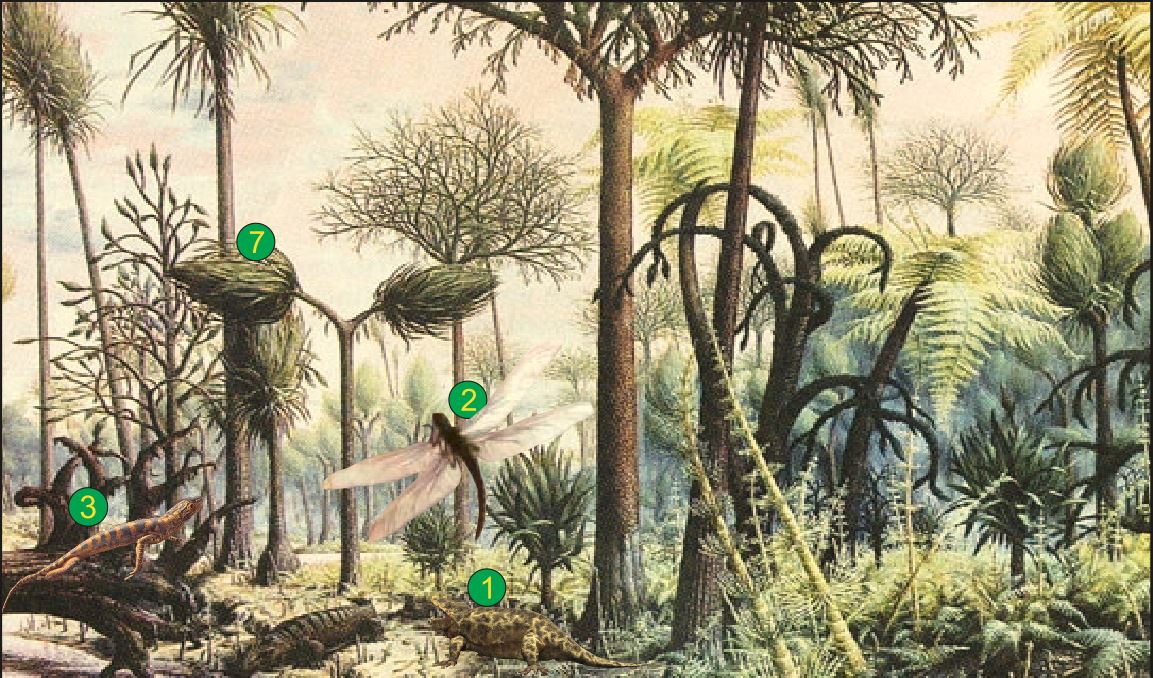 Životinjski svijet – U nepreglednim karbonskim močvarama dominirali su vodozemci. Neki su izgledali kao današnji krokodili (rod Eryops) (1), a neki su bili bez udova, nalik današnjim zmijama. U slatkim vodama i oko njih živjele su i ribe zrakoperke, slatkovodni školjkaši, crvi i člankonošci, od kojih su najbrojniji žohari. Uz močvare letjeli su i najveći kukci svih vremena s promjerom krila od 70-ak cm (2). Pred sam kraj karbona javljaju se i prvi primitivni gmazovi iz roda Hylonomus (3). Zahvaljujući velikom evolucijskom pomaku u razvoju amniotskog jajeta (4), u kojem je embrij ljuskom zaštićen od isušivanja, oni postaju brojniji od vodozemaca. Razvijaju se i nove vrste gmazova iz reda Pelycosauria (5), a od sredine perma javlja se i nova skupina gmazova, Terapsidi (6), koji postaju dominantna skupina. Bili su pokretljiviji i brži, a tijelo im je bilo prekriveno dlakom te su u manjoj mjeri bili ovisni o sunčevoj toplini. S tim prilagodbama oni postaju dominantna skupina kralježnjaka na Zemlji.